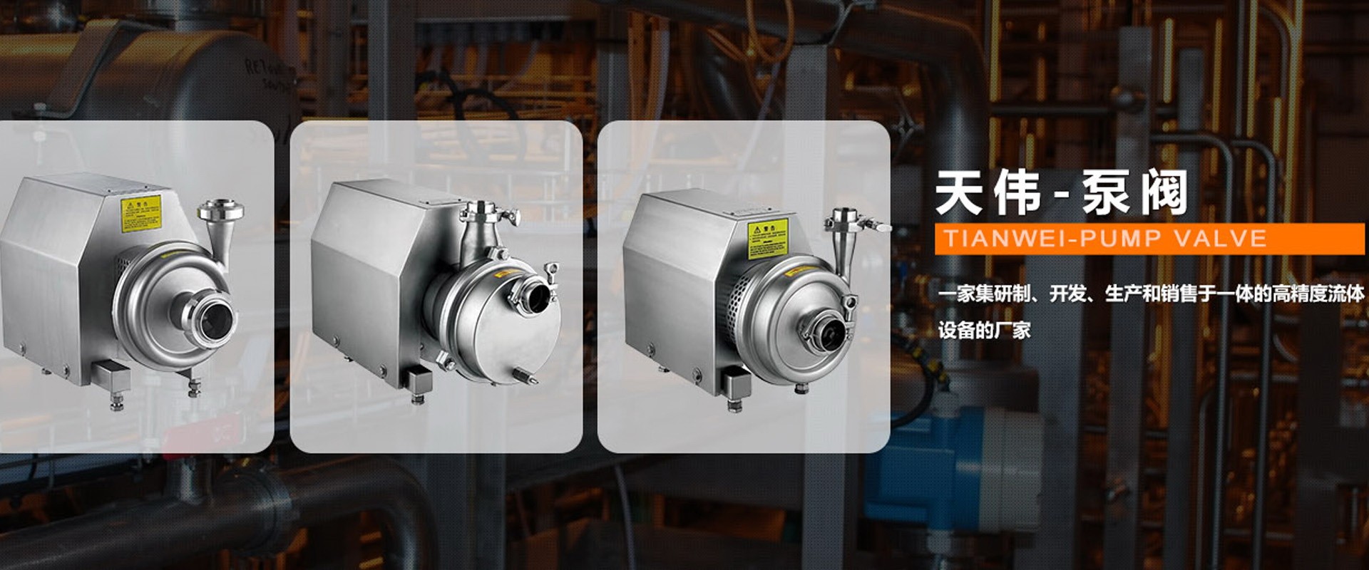 溫州天偉泵閥科技有限公司,毗鄰溫州萬噸碼頭,甬臺溫高速公路、溫州機場,地理位置優越,水陸交通暢捷,具有得天獨厚的發展優勢。是一家集研制、開發、生產和銷售于一體的高精度流體設備的廠家?! ∥宜局饕a品有:衛生級離心泵,自吸泵,CIP回程泵,防爆型離心泵,轉子泵,衛生閥門管件、管道鏈接件等產品。產品廣泛應用于食品、制藥、啤酒、乳制品、飲料、化妝品及精細化工等領域。產品均按客戶提供的技術參數及ISO、IDF、DIN 和3A等工業標準制造。各項技術均達到同行業領先水平,符合GMP藥典要求。公司堅信“用戶是我們產品...